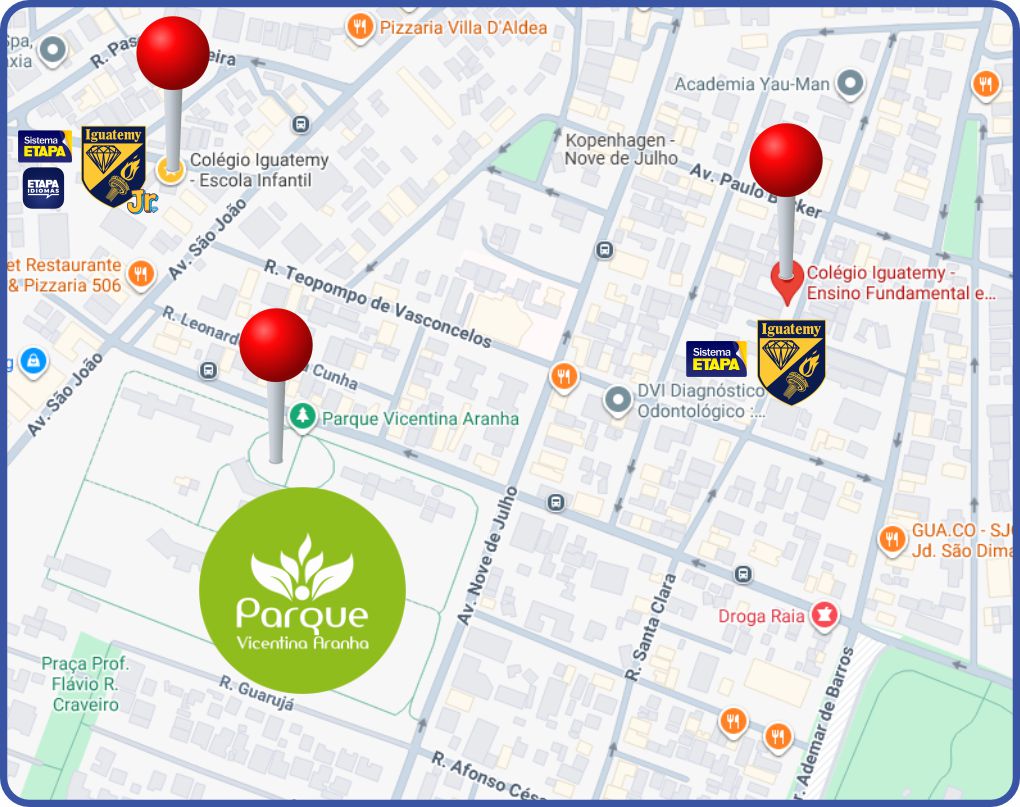 As unidades do Colégio Iguatemy se localizam muito próximas ao Parque Vicentina Aranha. A Unidade do Ensino Fundamental e Médio está a poucos minutos do parque. A Unidade da Educação Infantil, no Jardim Esplanada, também se encontra em região de fácil acesso.
